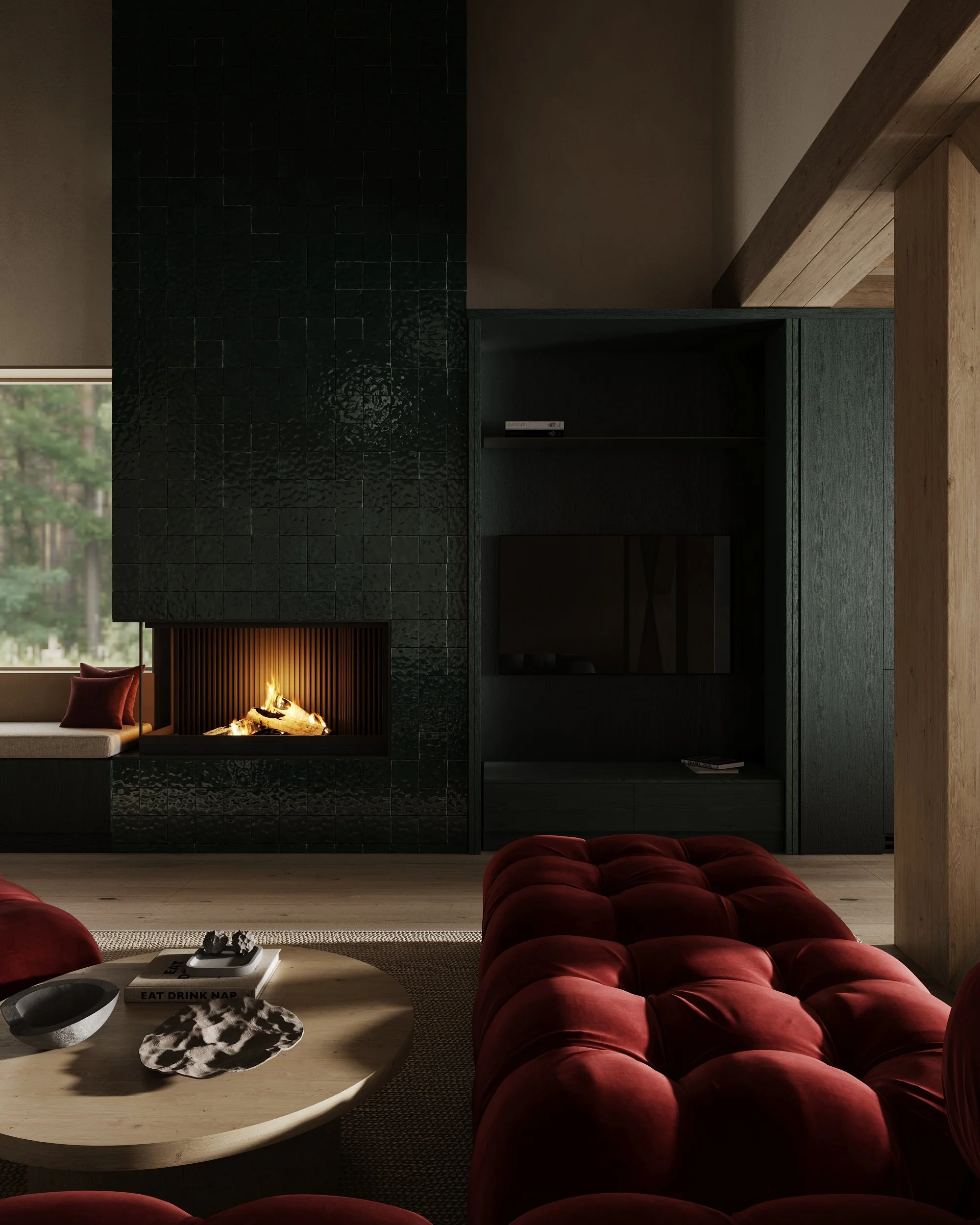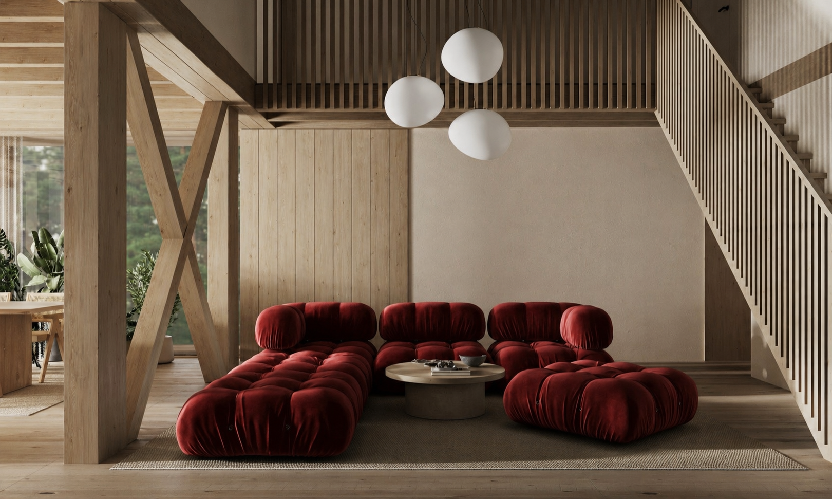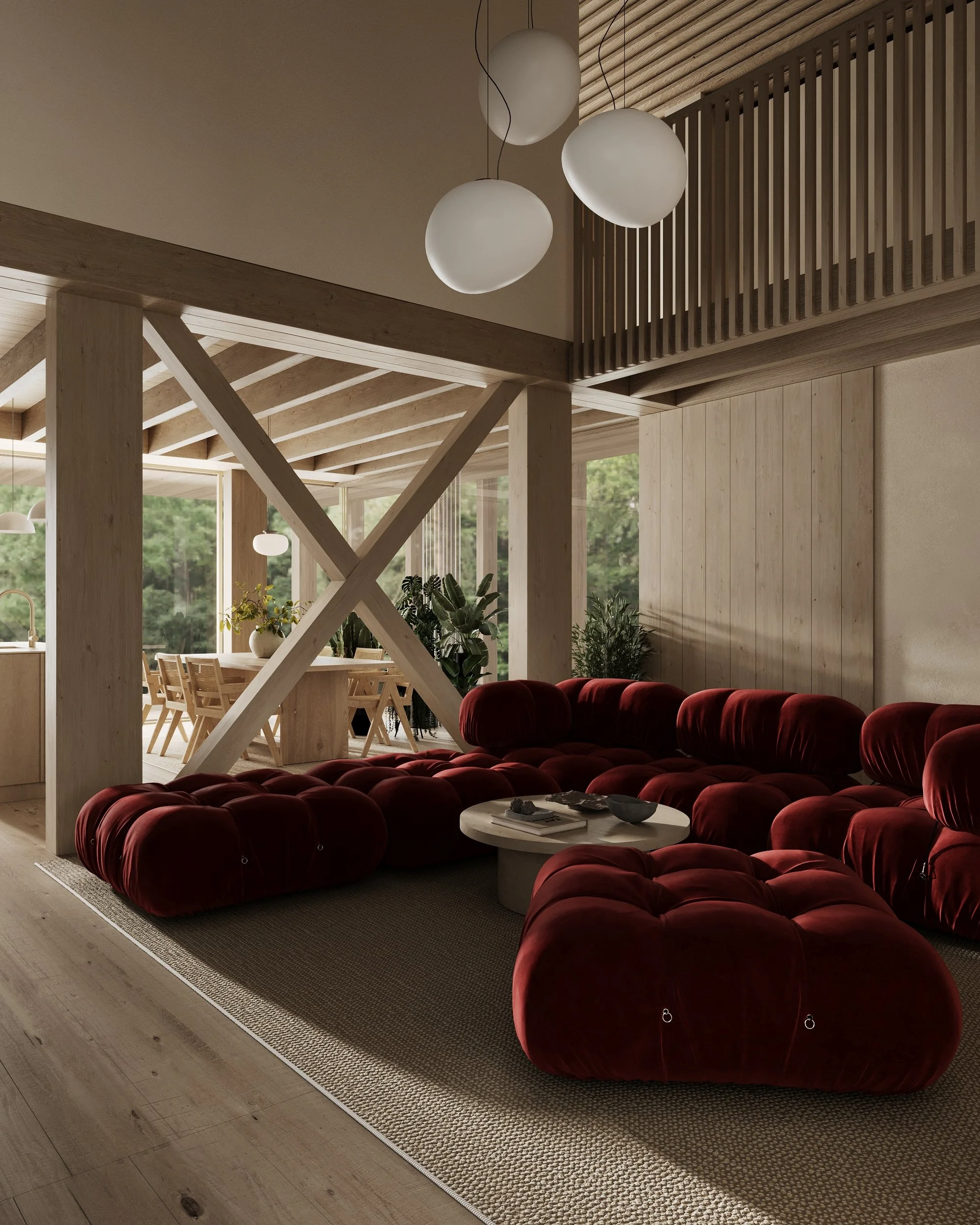 The living area rises in a double-height volume, as a measured intensification of space. The vertical expansion introduces light, air, and distance, while maintaining an intimate relation to the body and to the landscape beyond. Within this restrained wooden field, the dark red seating appears almost as a saturated topography — dense, tactile, and sensual.