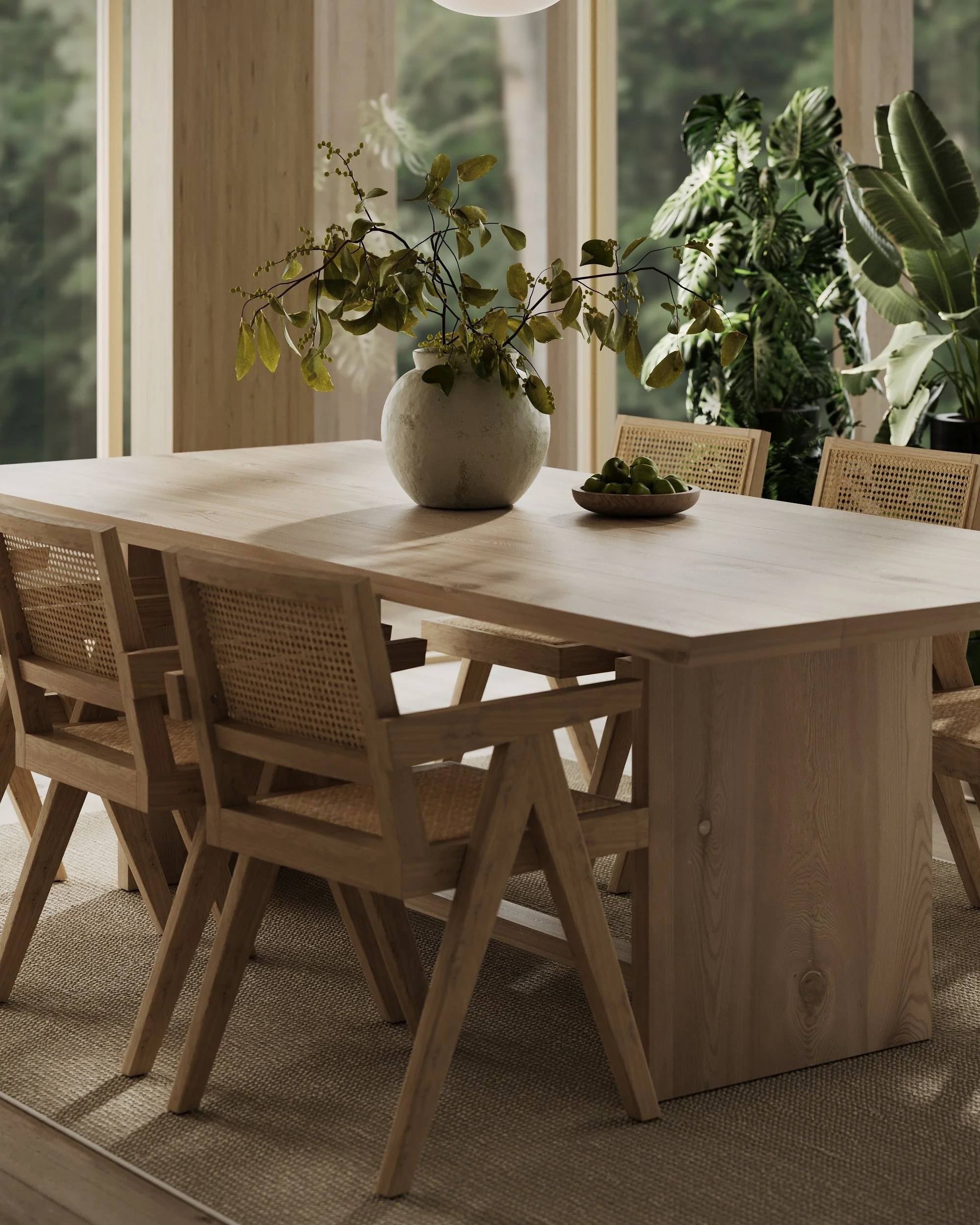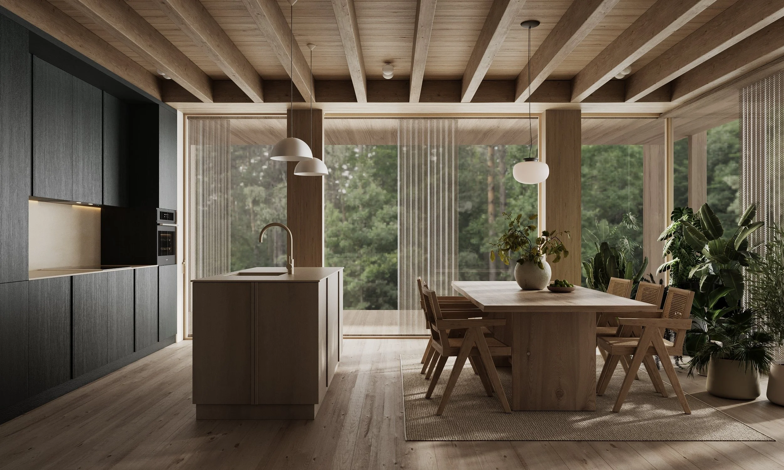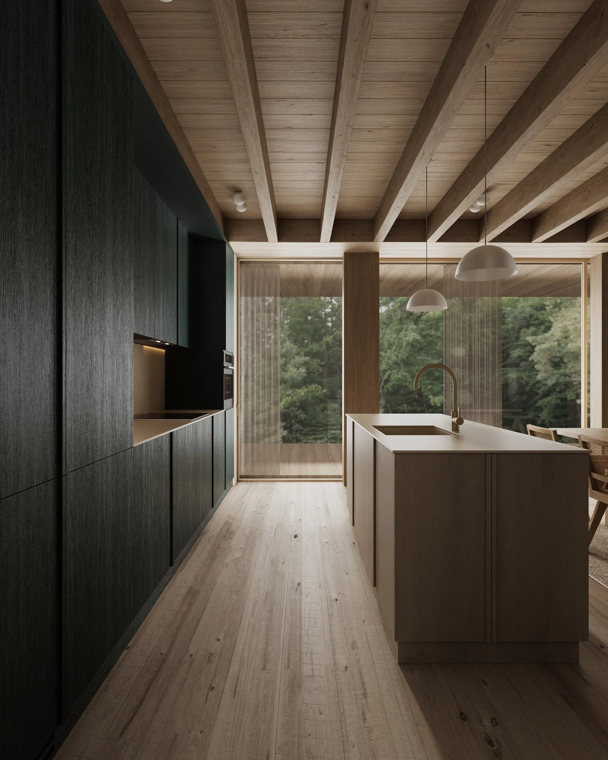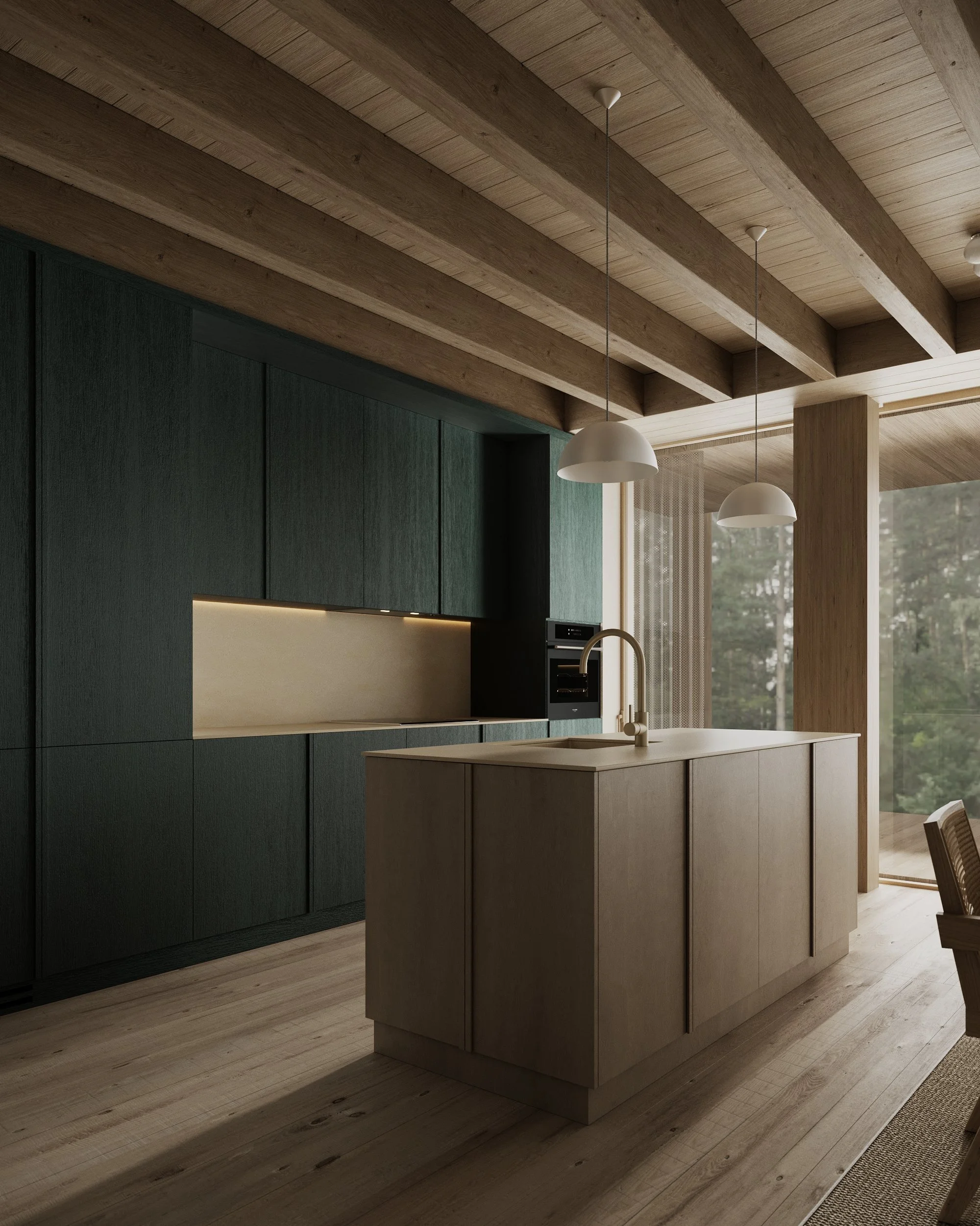 Dark green-stained veneer deepens the interior further, introducing a muted chromatic tension that recalls shadow, moss, and the density of the forest. The project is defined by these subtle shifts: between openness and enclosure, softness and structure, neutrality and intensity. What emerges is an image of domesticity, a precise spatial mood — a warm, introspective interior where material, color, and proportion construct a quiet but immersive world.