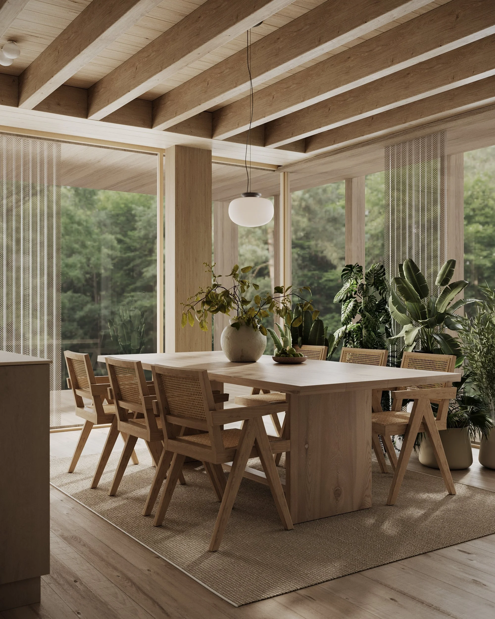 This interior is conceived as a sheltered clearing within the timber structure, a space where architecture withdraws into atmosphere and material presence. Set in the midst of untouched nature, the house absorbs its surroundings. Wood becomes envelope, structure, surface, and light-modulating device — an almost continuous matter through which the space acquires depth, silence, and warmth.