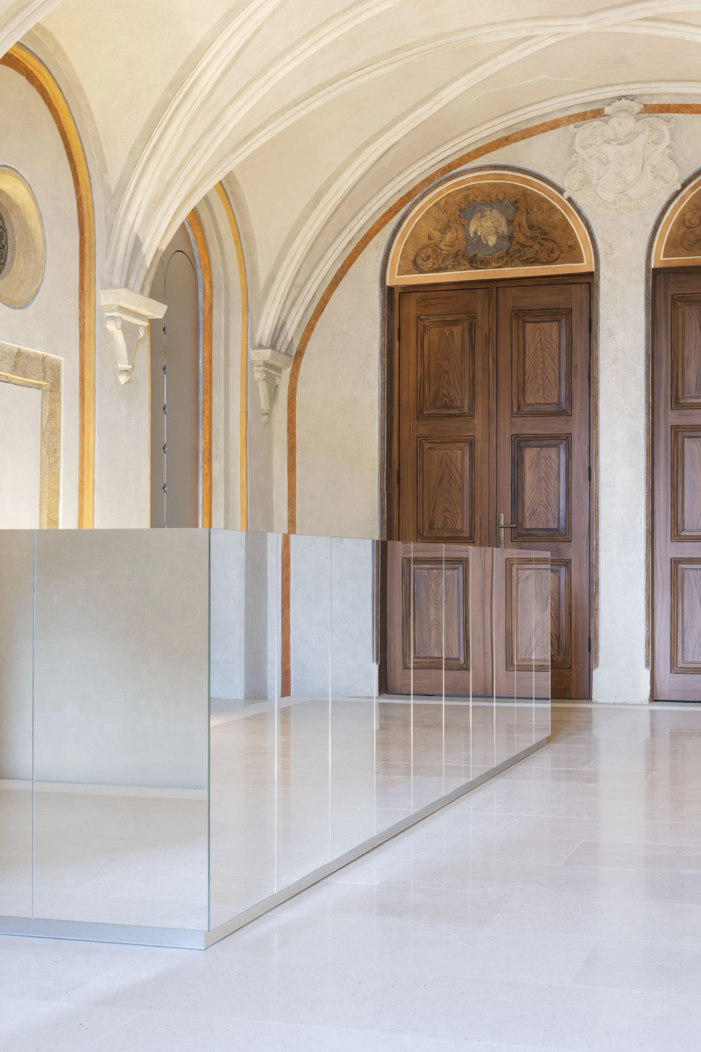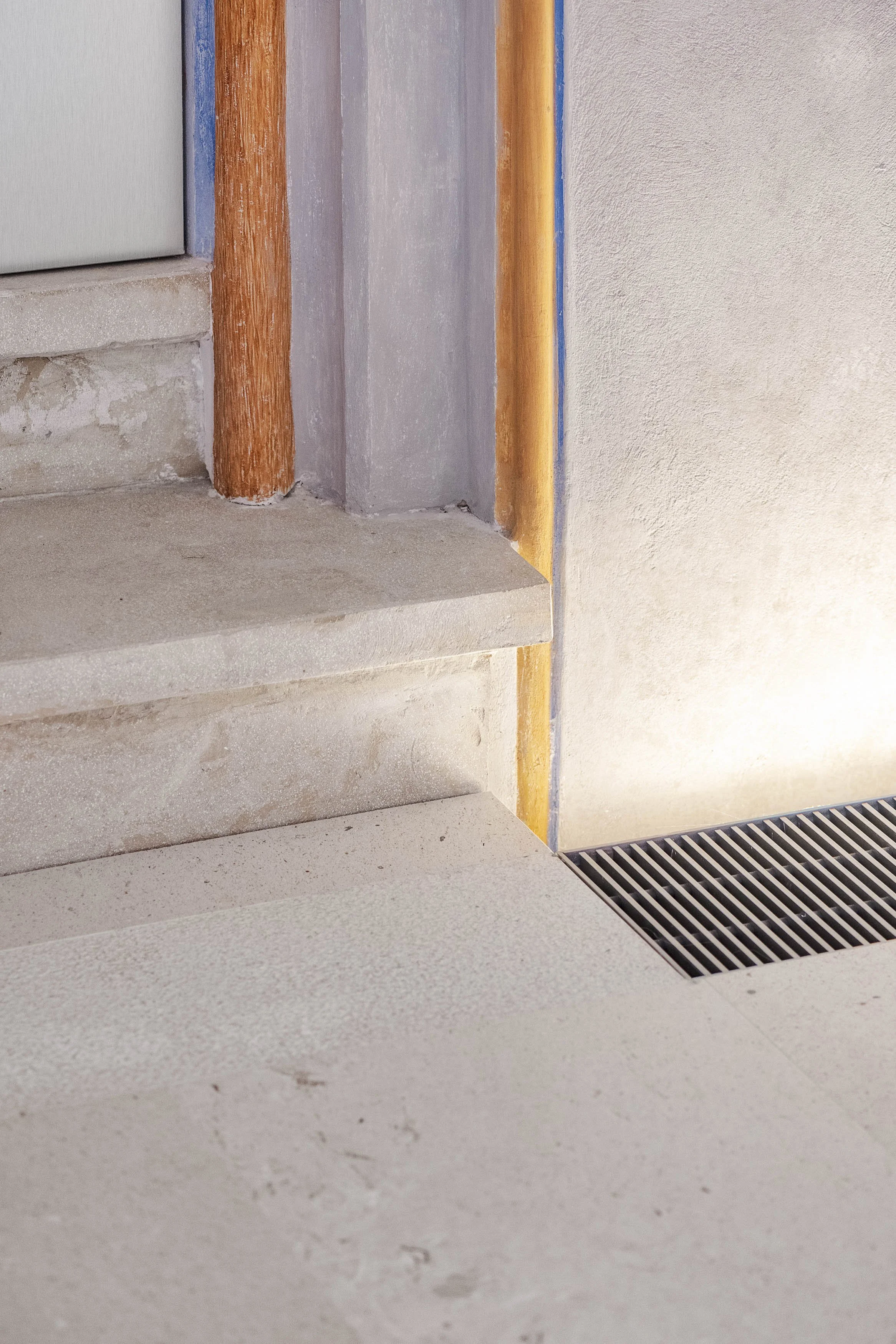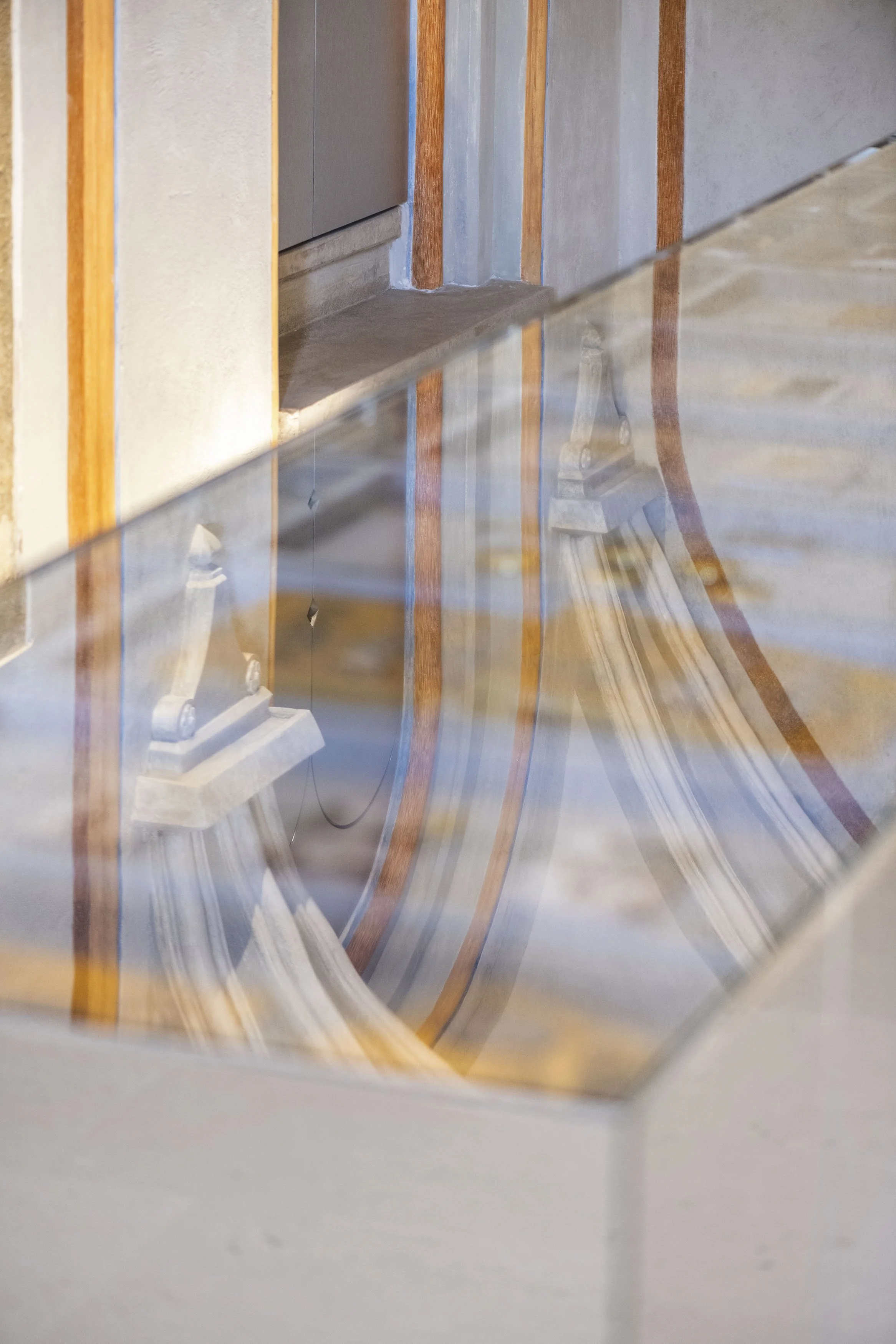 The intervention preserves, restores, and reconstructs the surviving historical fabric while introducing a new architectural layer with clarity and restraint. In the entrance hall and adjoining rooms, original wall and ceiling paintings, fragments of stone flooring, and historic joinery were uncovered and restored after the removal of later invasive alterations. A new stone floor, conceived after the logic of the original one, integrates all technical installations and allows the restored walls and ceilings to remain visually intact. New furnishings and inserted elements are deliberately contemporary in expression, yet carefully composed to resonate with the proportions, rhythms, and atmosphere of the existing spaces.